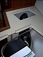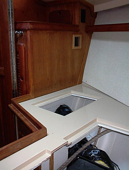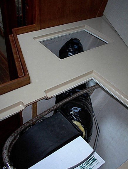 The center piece between the two access holes was removed.   The air discharges to the port side and runs through both of the hanging lockers.  The condensate discharges through a drilled to fit hole to the bilge.