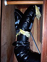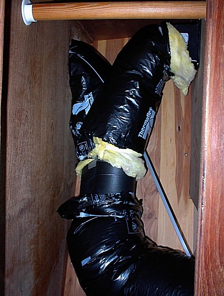 Here the air discharge for the main cabin enters from the right and discharges to the left just above the port side settee.  The discharge was is installed at the very top back of the locker allowing for normal usage of space.